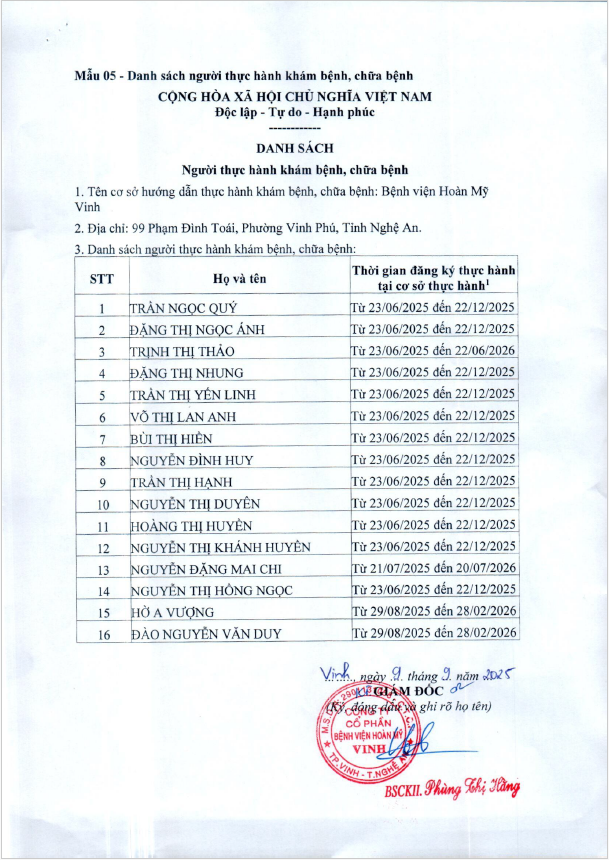 Danh sách người thực hiện thực hành khám bênh, chữa bệnh tại bệnh viện Hoàn Mỹ Vinh