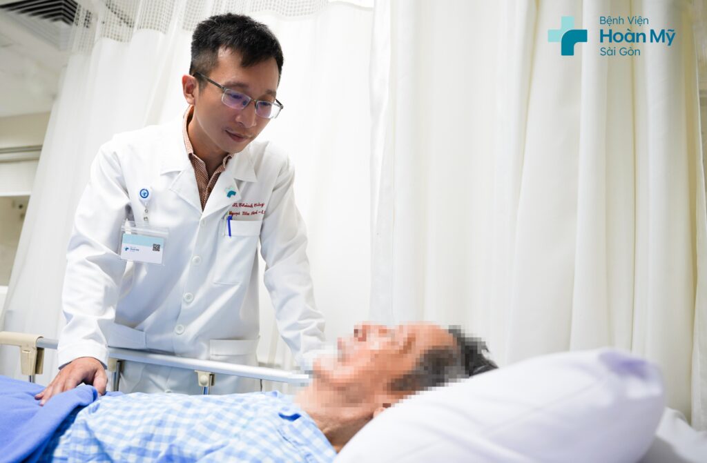 Bác sĩ Công thăm khám cho người bệnh sau phẫu thuật