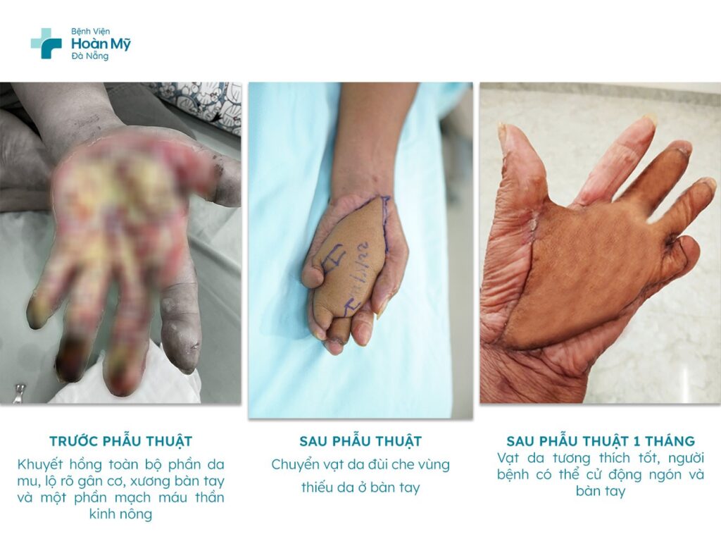 Trước đó, bệnh viện Hoàn Mỹ Đà Nẵng đã tiếp nhận một trường hợp người bệnh nam 60 tuổi, trú tỉnh Quảng Nam trong lúc sinh hoạt bị bỏng điện bàn tay trái. Người bệnh mất gần như toàn bộ phần da mu bàn tay trái, lộ rõ phần gân cơ, xương của bàn tay và các ngón tay, kèm hư một phần mạch máu thần kinh nông.