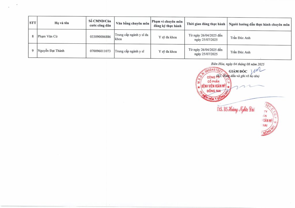 Danh sách người thực hành khám chữa bệnh tại Bệnh viện Hoàn Mỹ Đồng Nai ngày 31.07.2025
