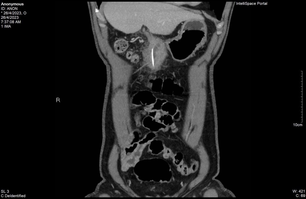 Dù đã tự uống thuốc giảm đau nhưng không thuyên giảm, cơn đau càng ngày càng tăng nên nhập viện cấp cứu. ThS. BS Phạm Hoàng Thiên- Trưởng Khoa Cấp cứu, BV Hoàn Mỹ Sài Gòn người trực tiếp tiếp nhận bệnh cho biết “Qua thăm khám ban đầu tại khoa Cấp cứu, nghi ngờ có khối áp xe ổ bụng trên người bệnh có các bệnh mạn tính nặng như tăng huyết áp, bệnh tim thiếu máu cục bộ, đái tháo đường, suy thượng thận và viêm dạ dày, chúng tôi tiến hành cho người bệnh chụp CT bụng và vùng chậu bằng thuốc cản quang. Kết quả cho thấy người bệnh bị áp xe ổ bụng vùng trước hang môn vị dạ dày do có dị vật dạng que thẳng dài 40mm, đường kính ngang 2mm nghi đâm xuyên thành dạ dày ra ngoài”