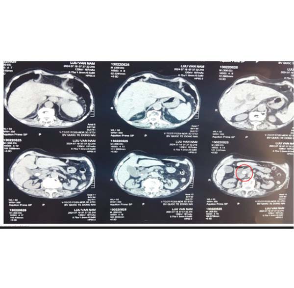 Sau đó, bệnh nhân được chụp CT scan bụng, phát hiện sỏi khoảng 15mm ở đoạn cuối ống mật chủ, sỏi ở ống gan chung và nhánh trái của gan khoảng 12mm. đường mật trong và ngoài gan giãn, ít sỏi bùn túi mật. Xét nghiệm máu có Bilirubin toàn phần và trực tiếp tăng chiếm ưu thế.