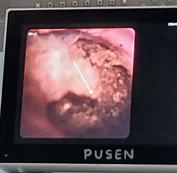 Khi soi xuống ống mật chủ, các Bác sĩ phát hiện vẫn còn một viên sỏi khoảng 15mm bị kẹt ở đoạn cuối ống mật chủ và không thể lấy bằng dụng cụ Randal.