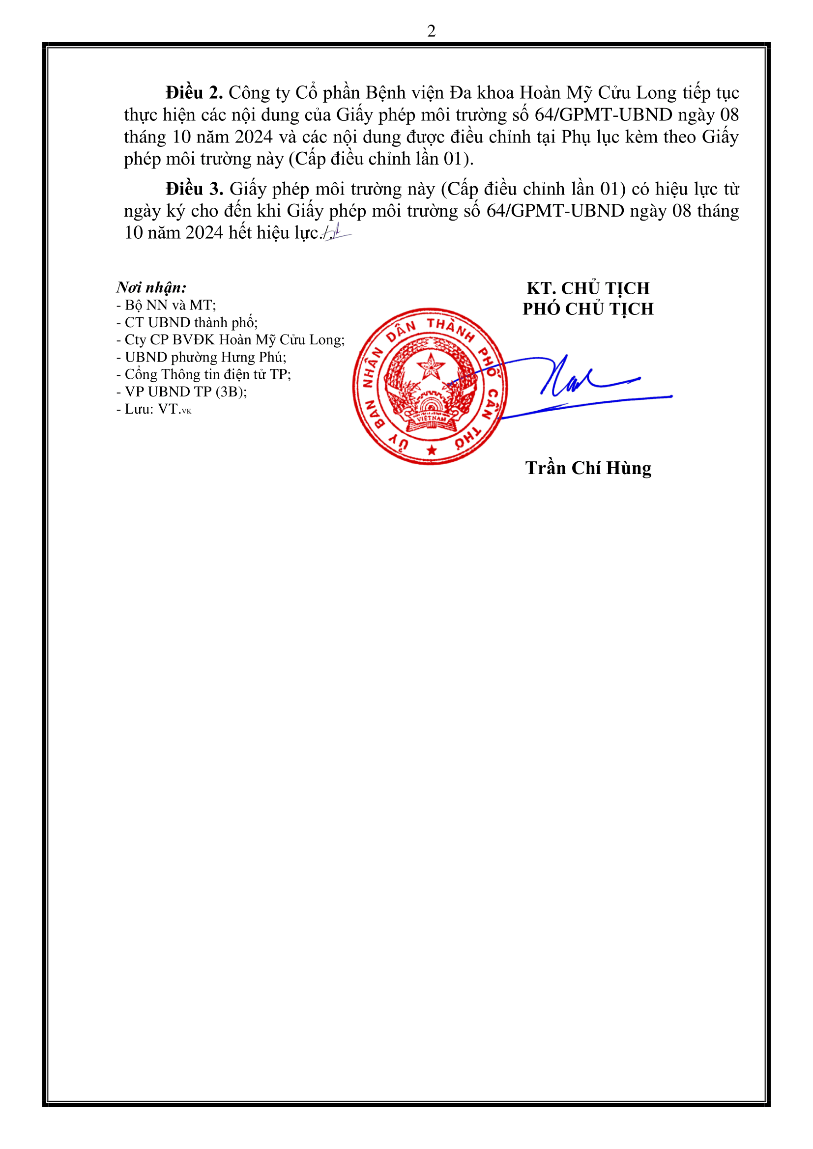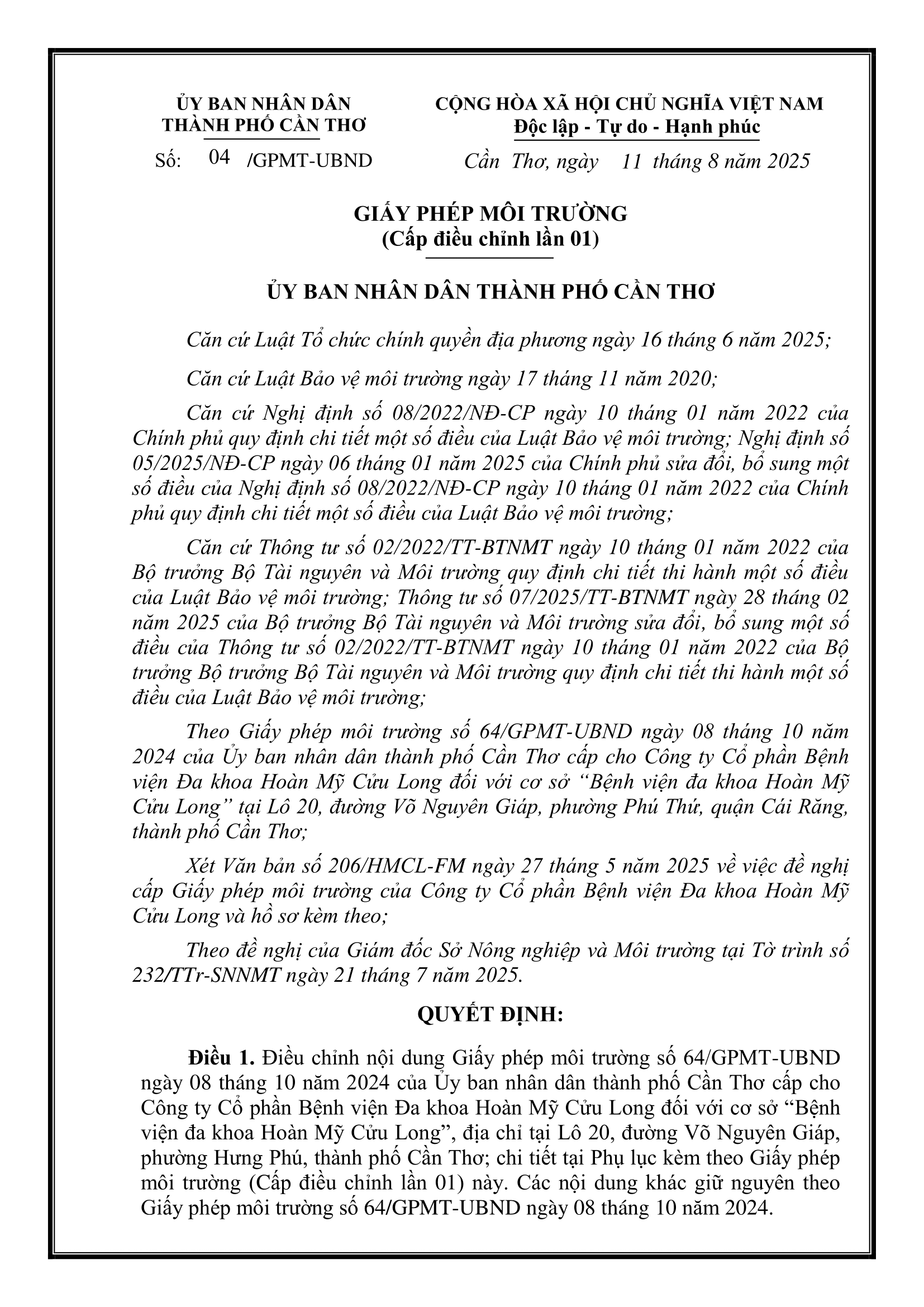 Giấy phép môi trường 2025 – Bệnh viện Hoàn Mỹ Cửu Long