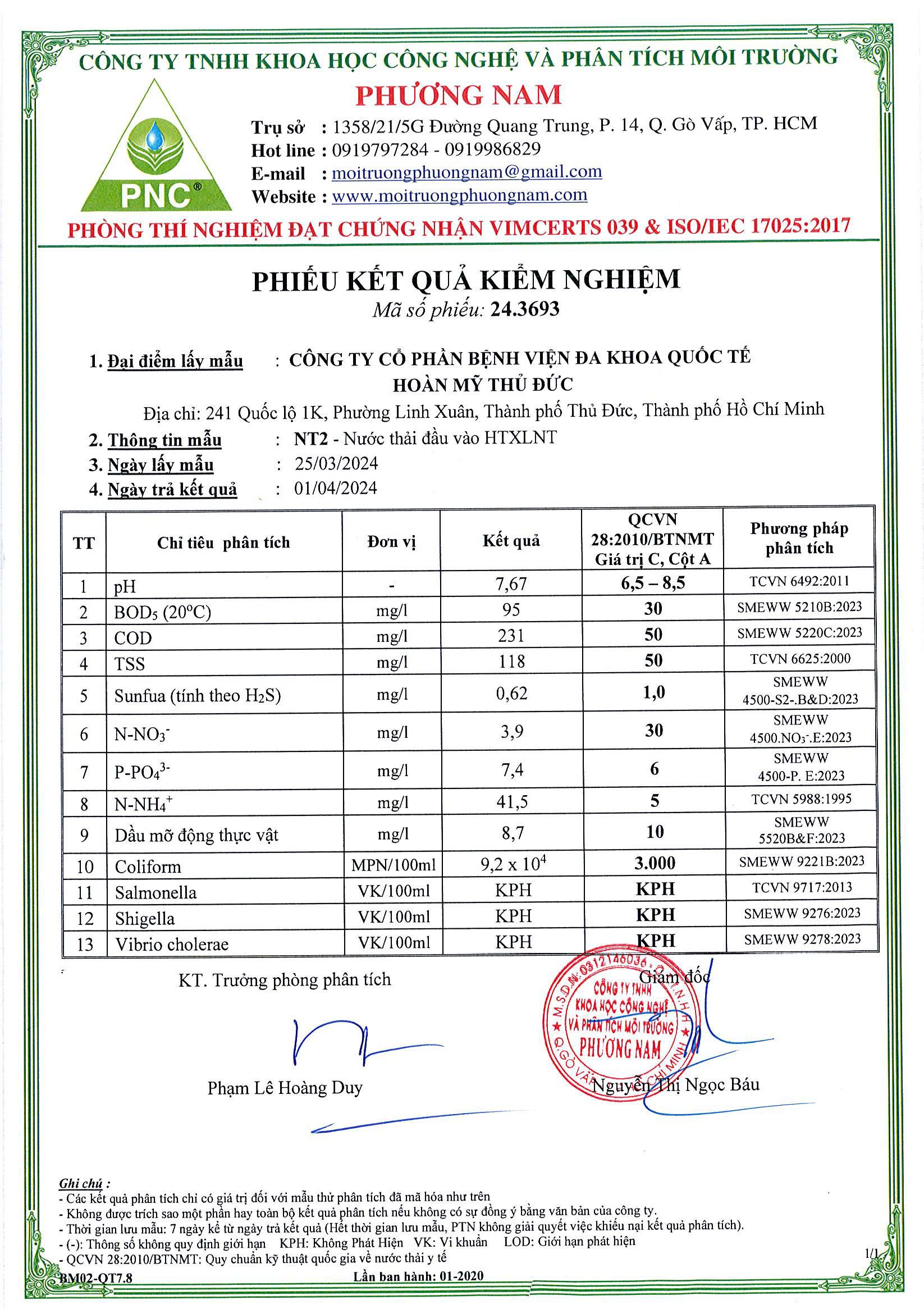 Kết quả mẫu nước thải quý I – 2024 – Bệnh viện Hoàn Mỹ Thủ Đức