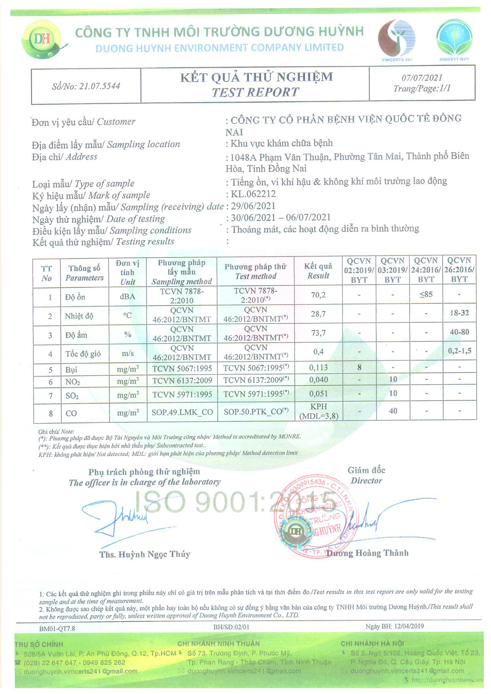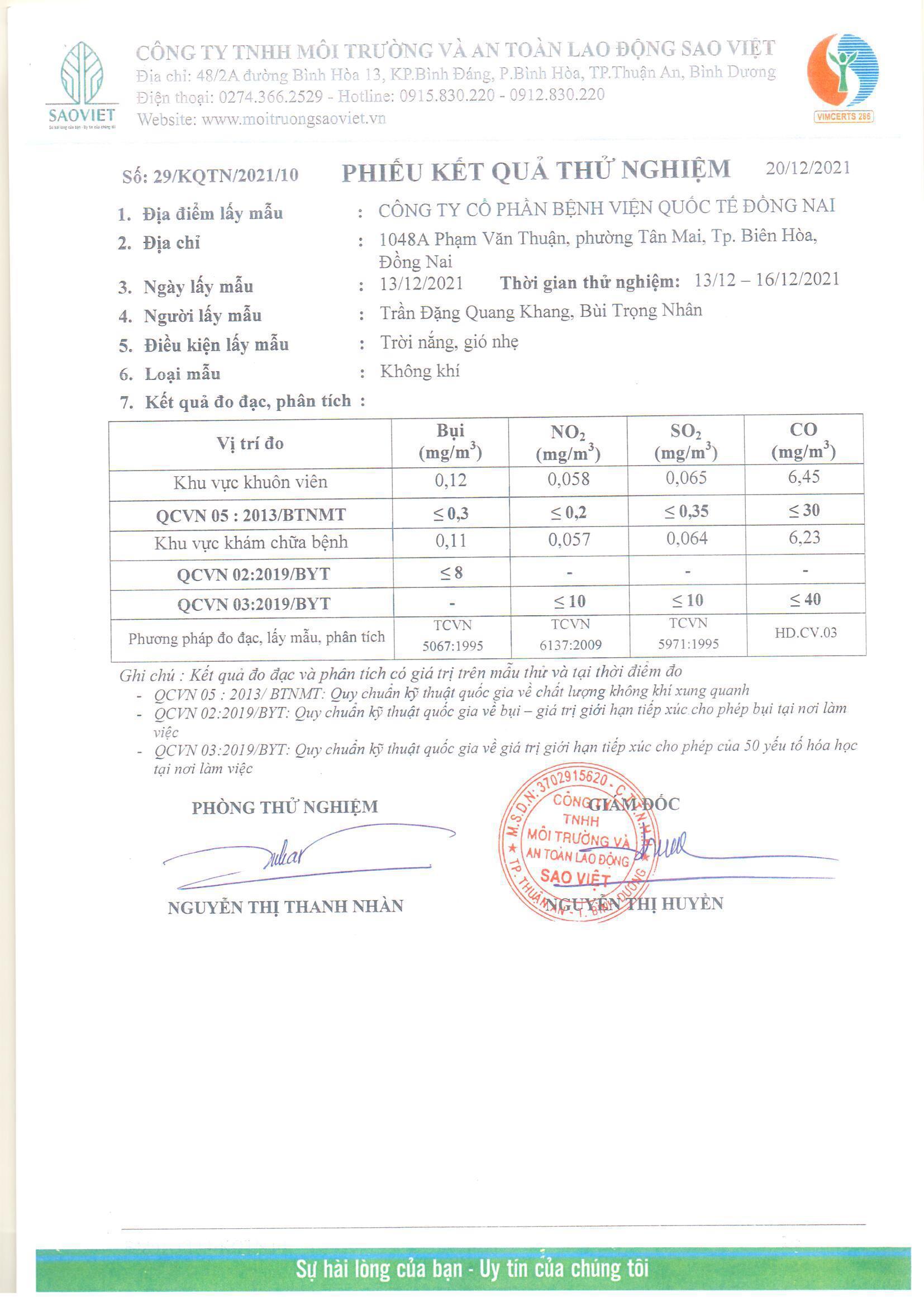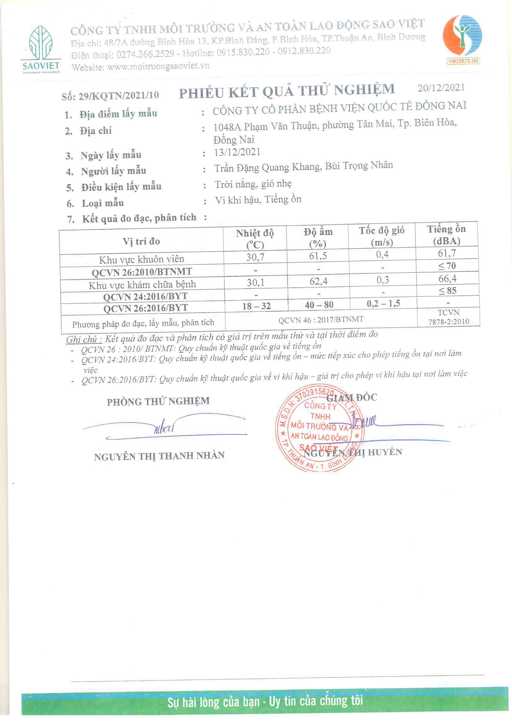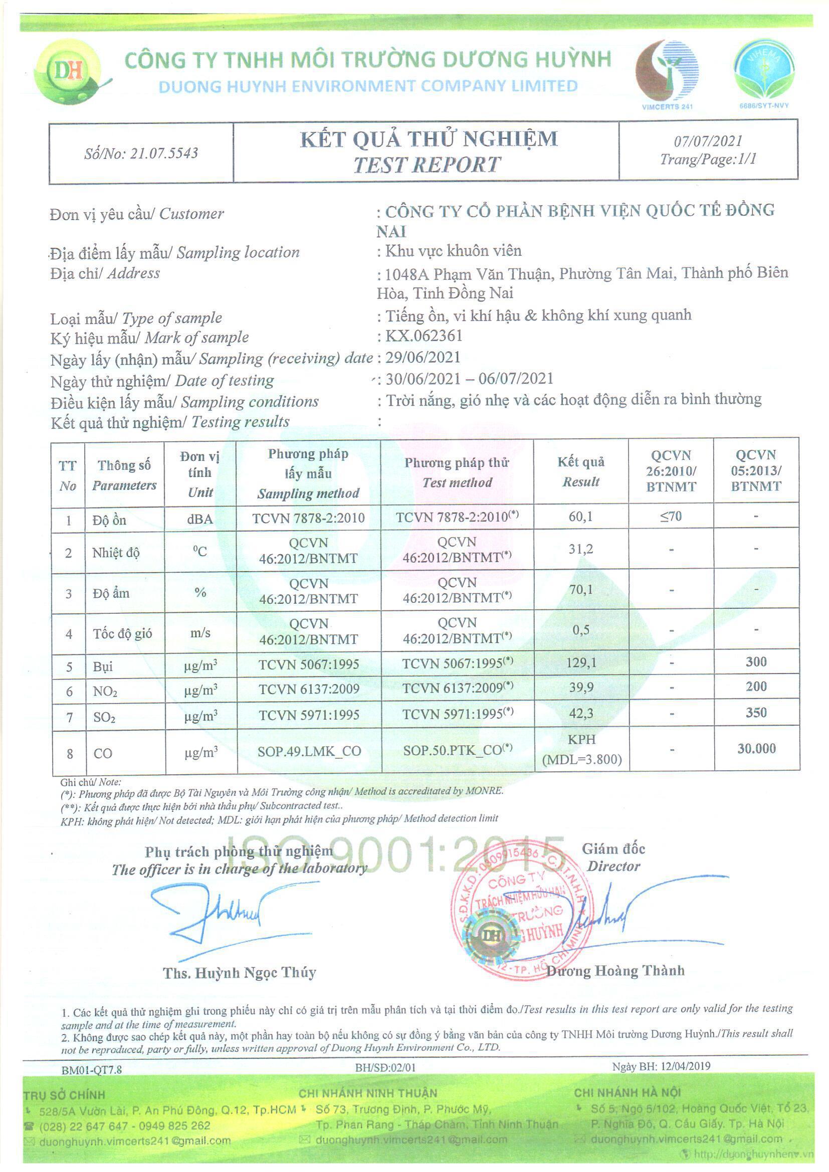 Kết quả quan trắc học 2021 Bệnh viện Hoàn Mỹ Đồng Nai