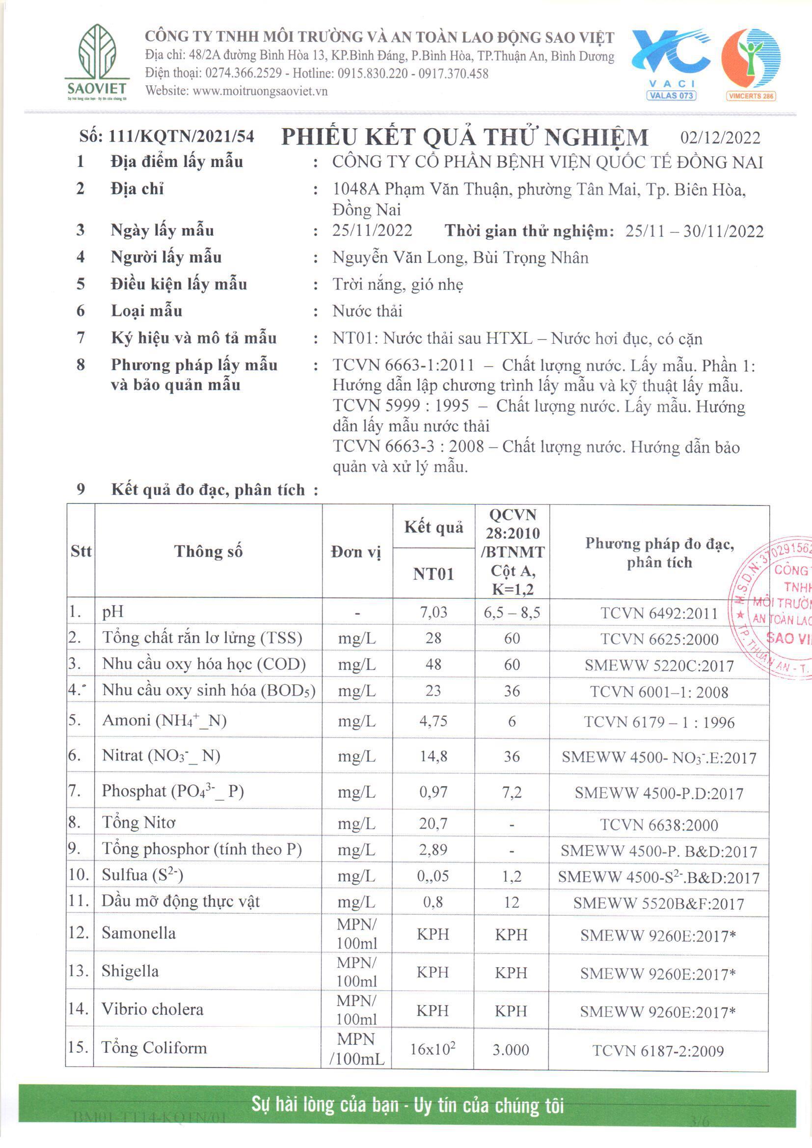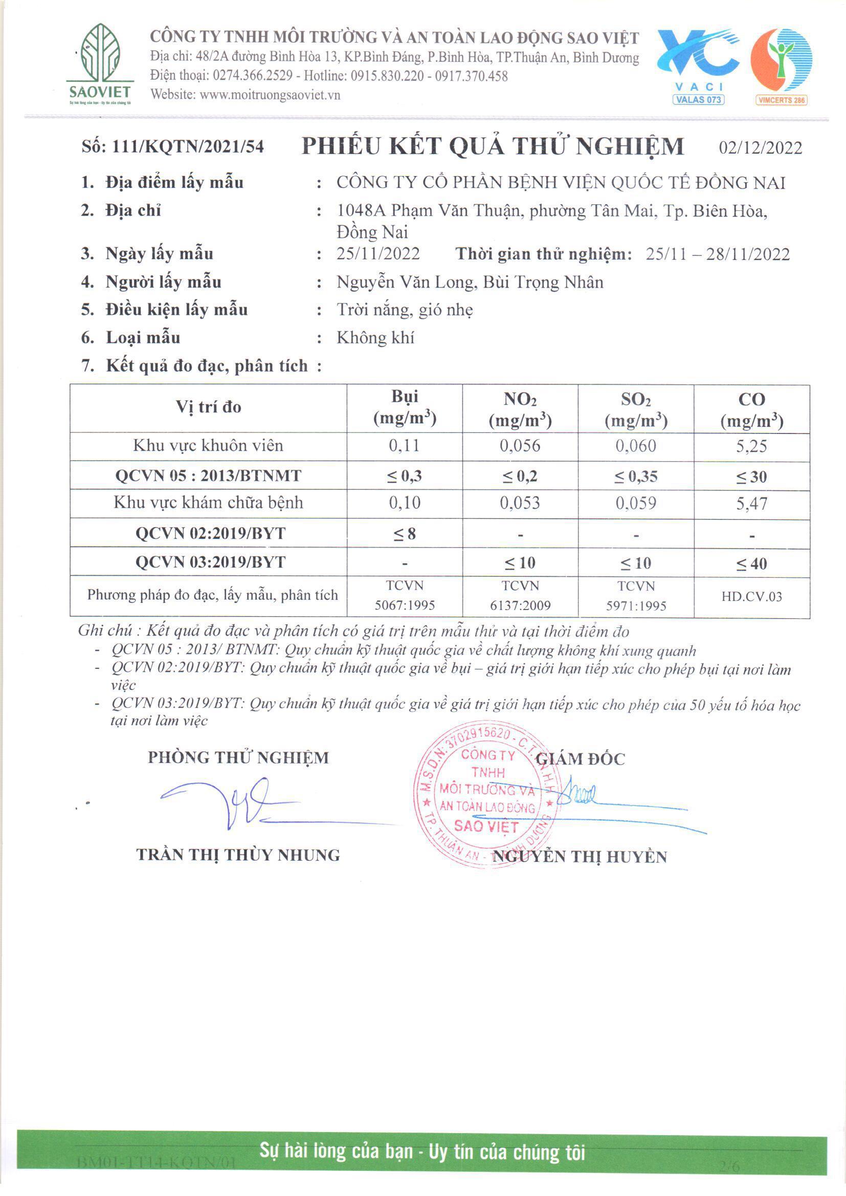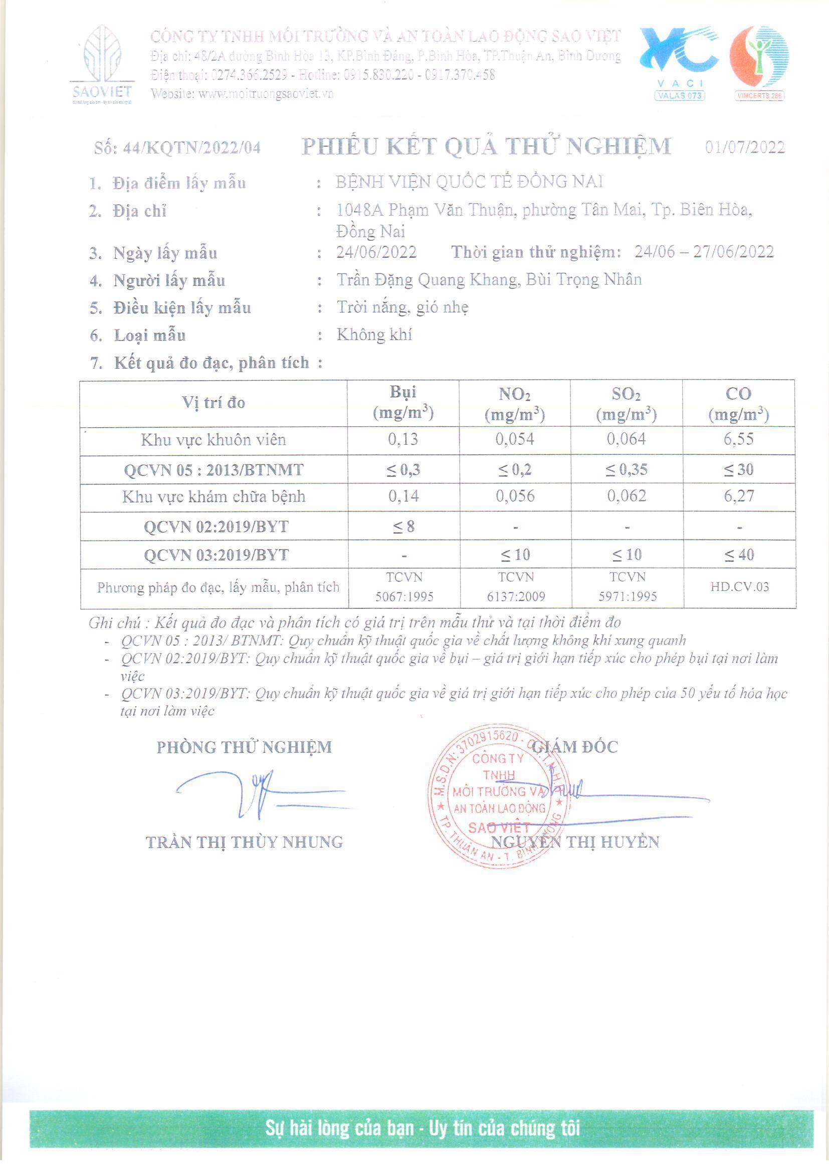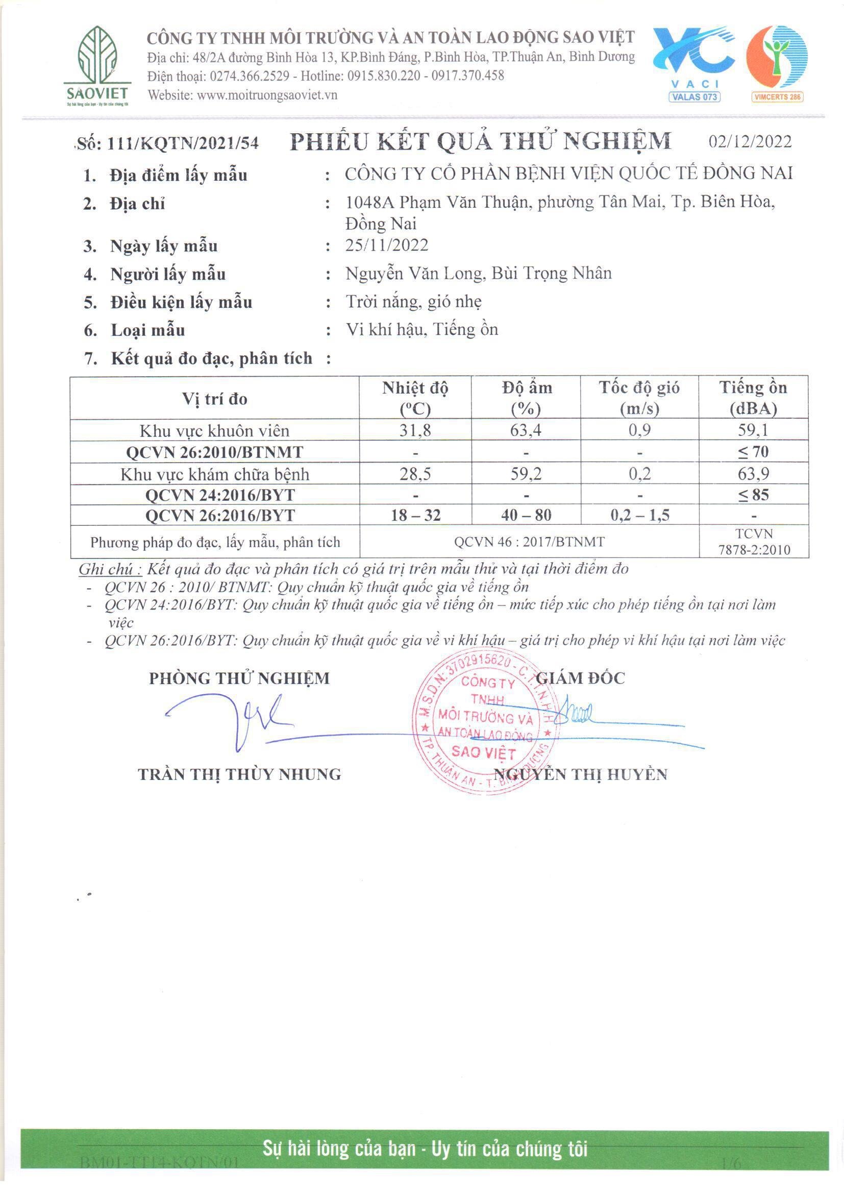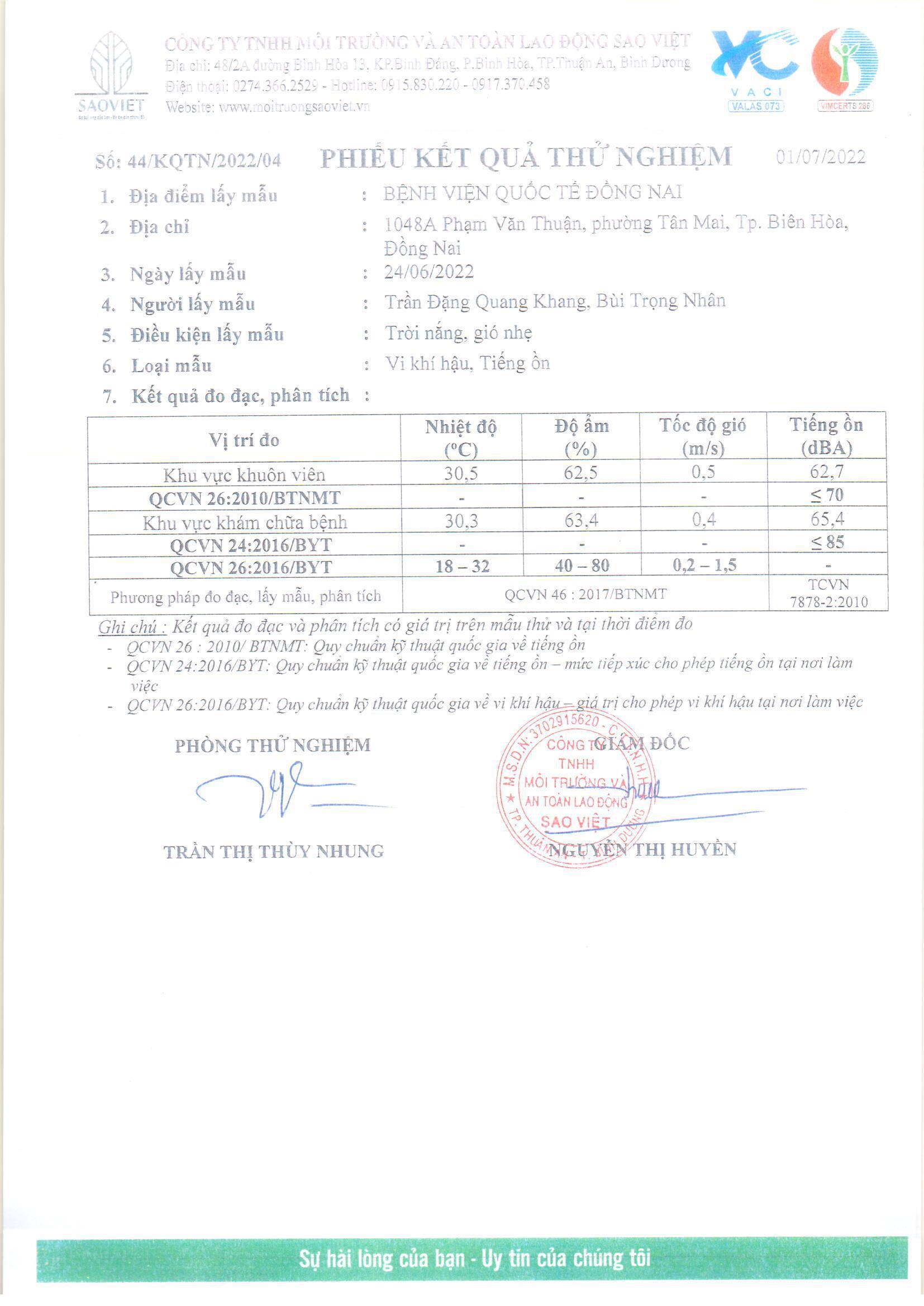Kết quả quan trắc học 2022 Bệnh viện Hoàn Mỹ Đồng Nai