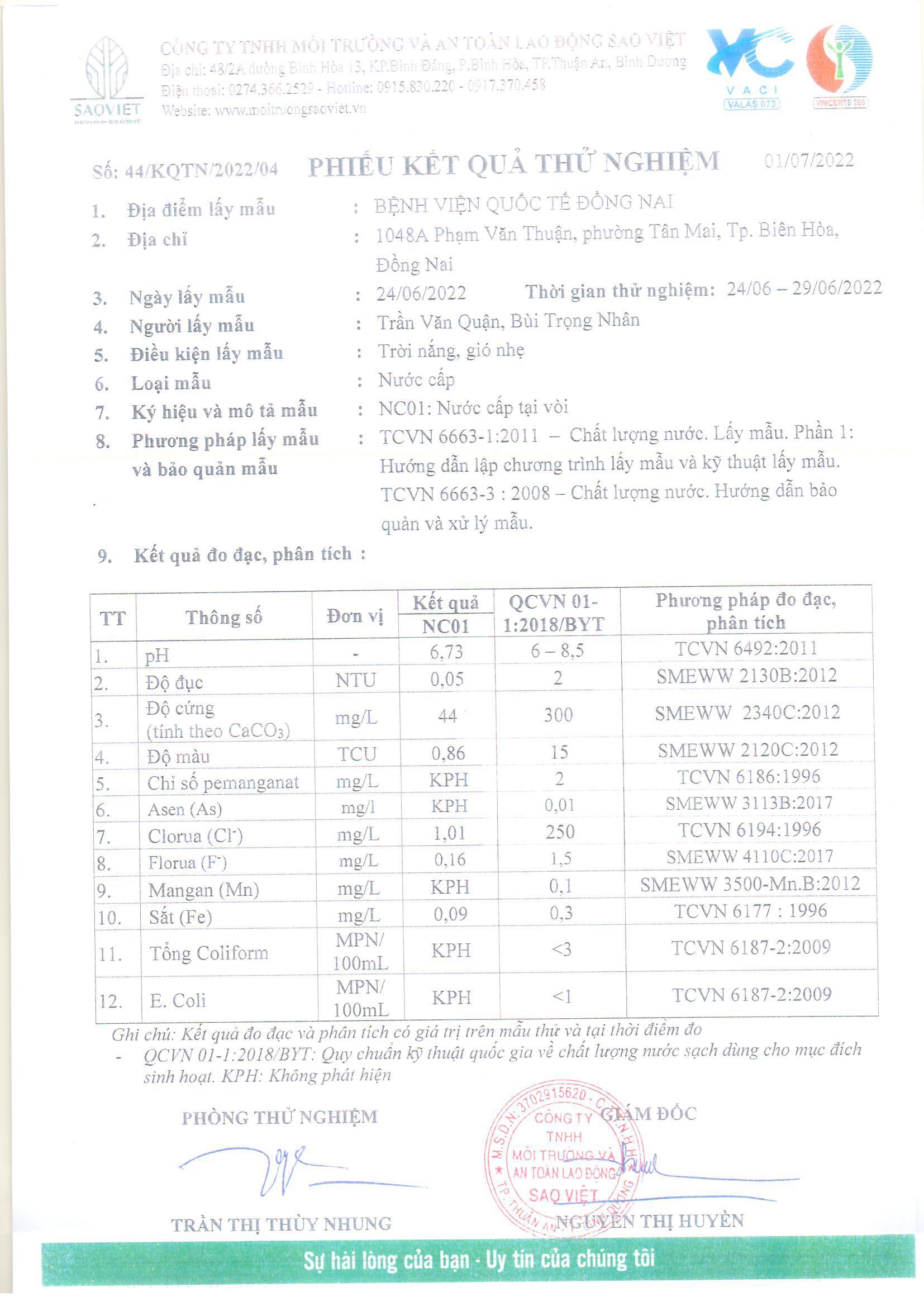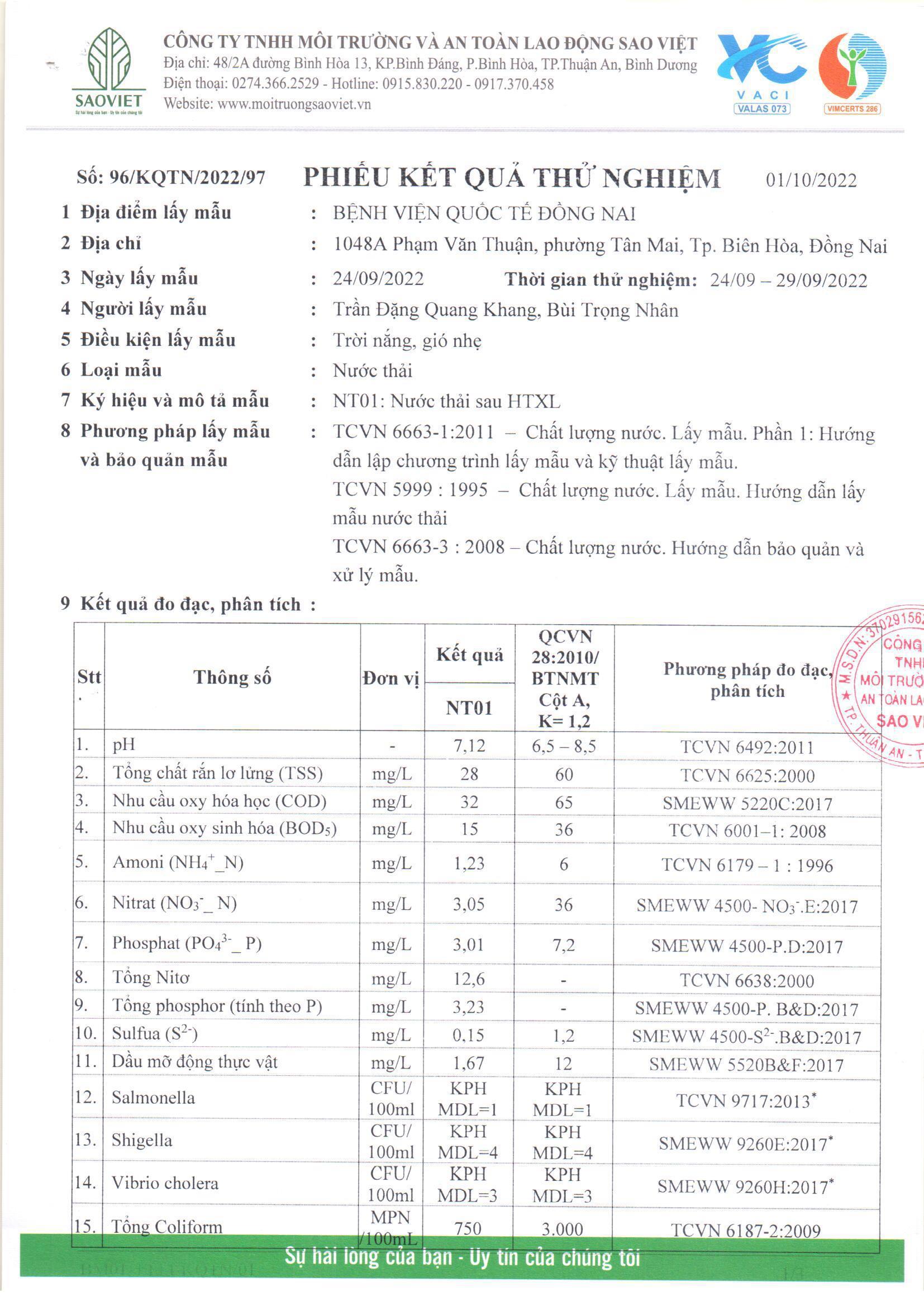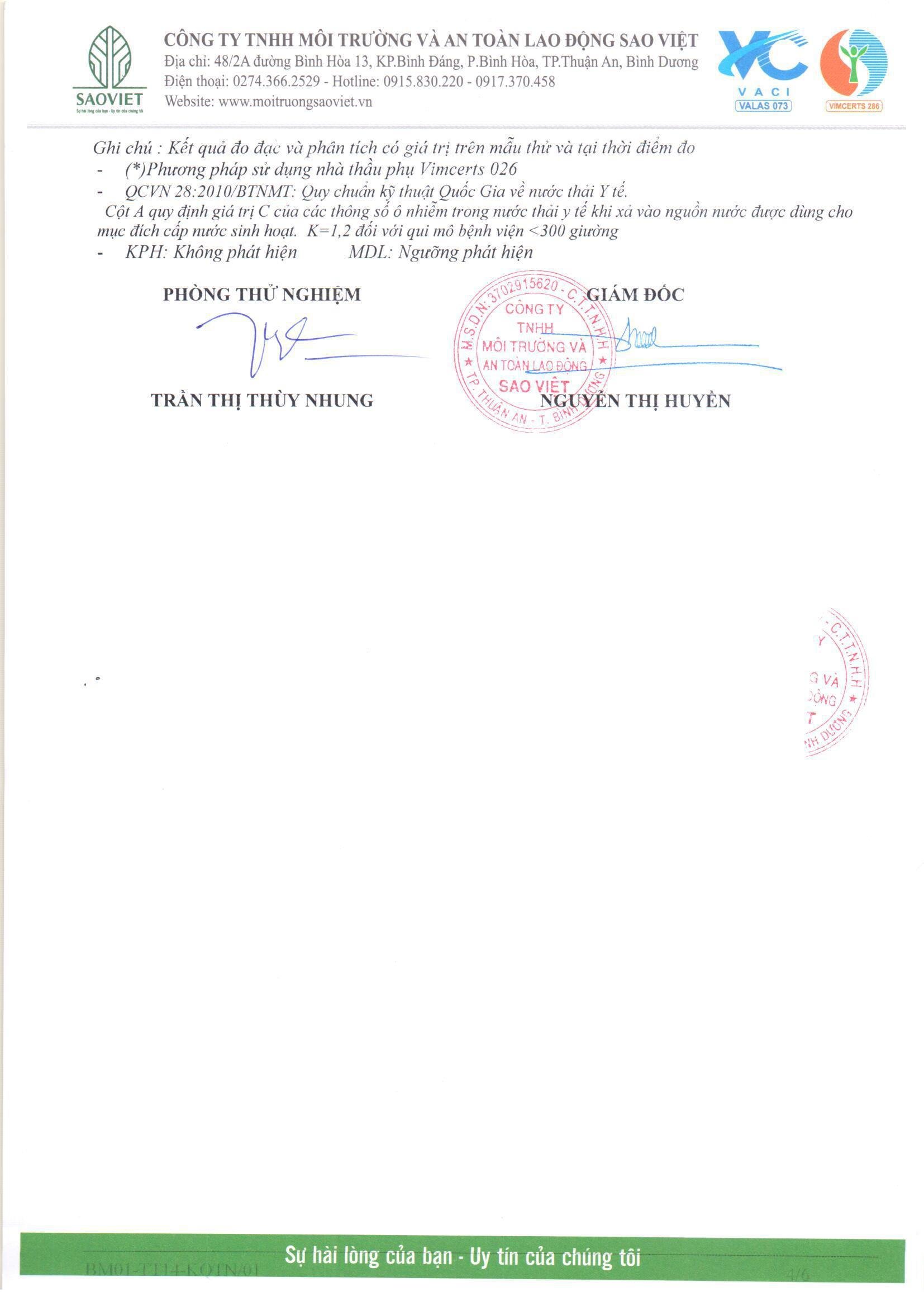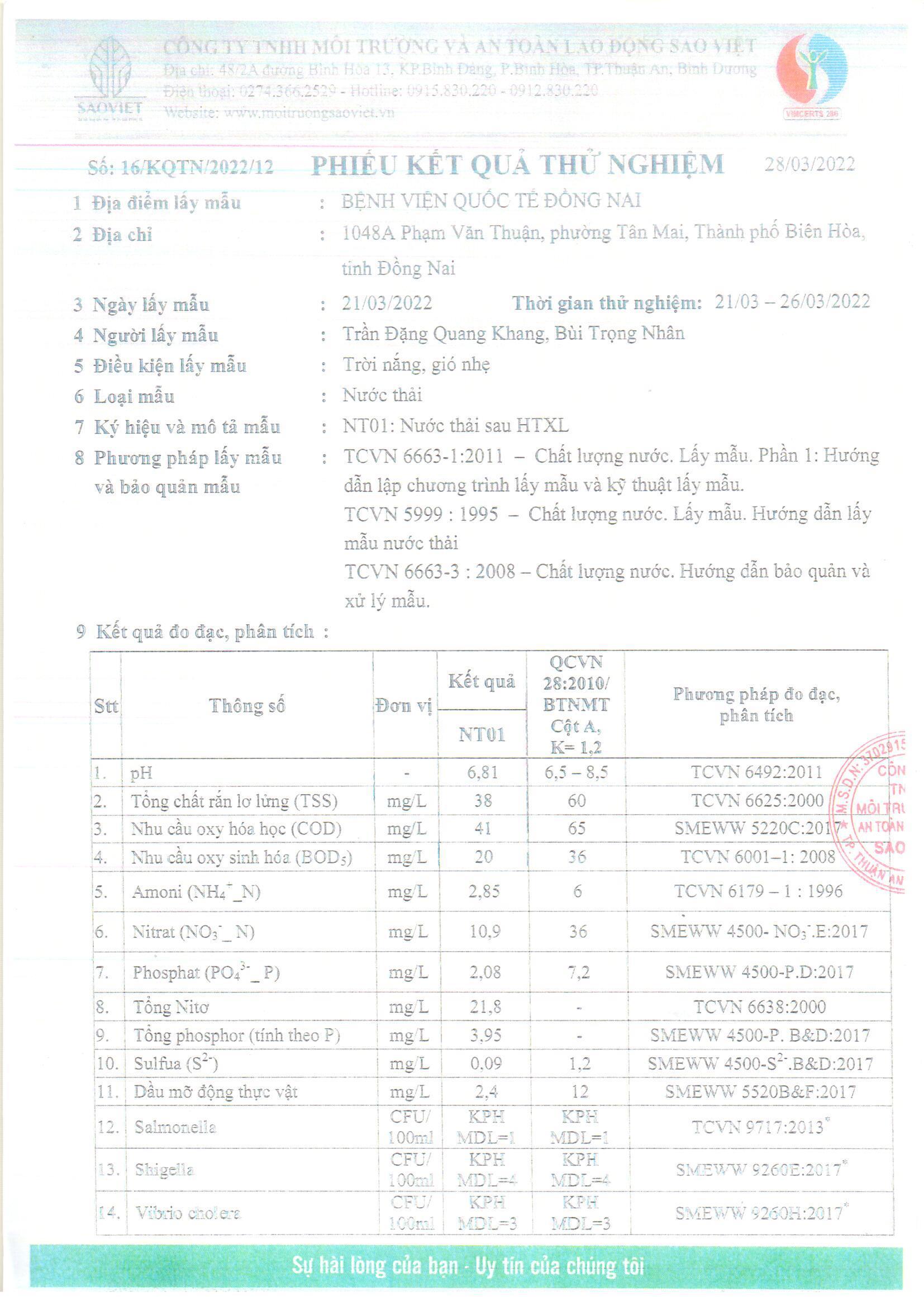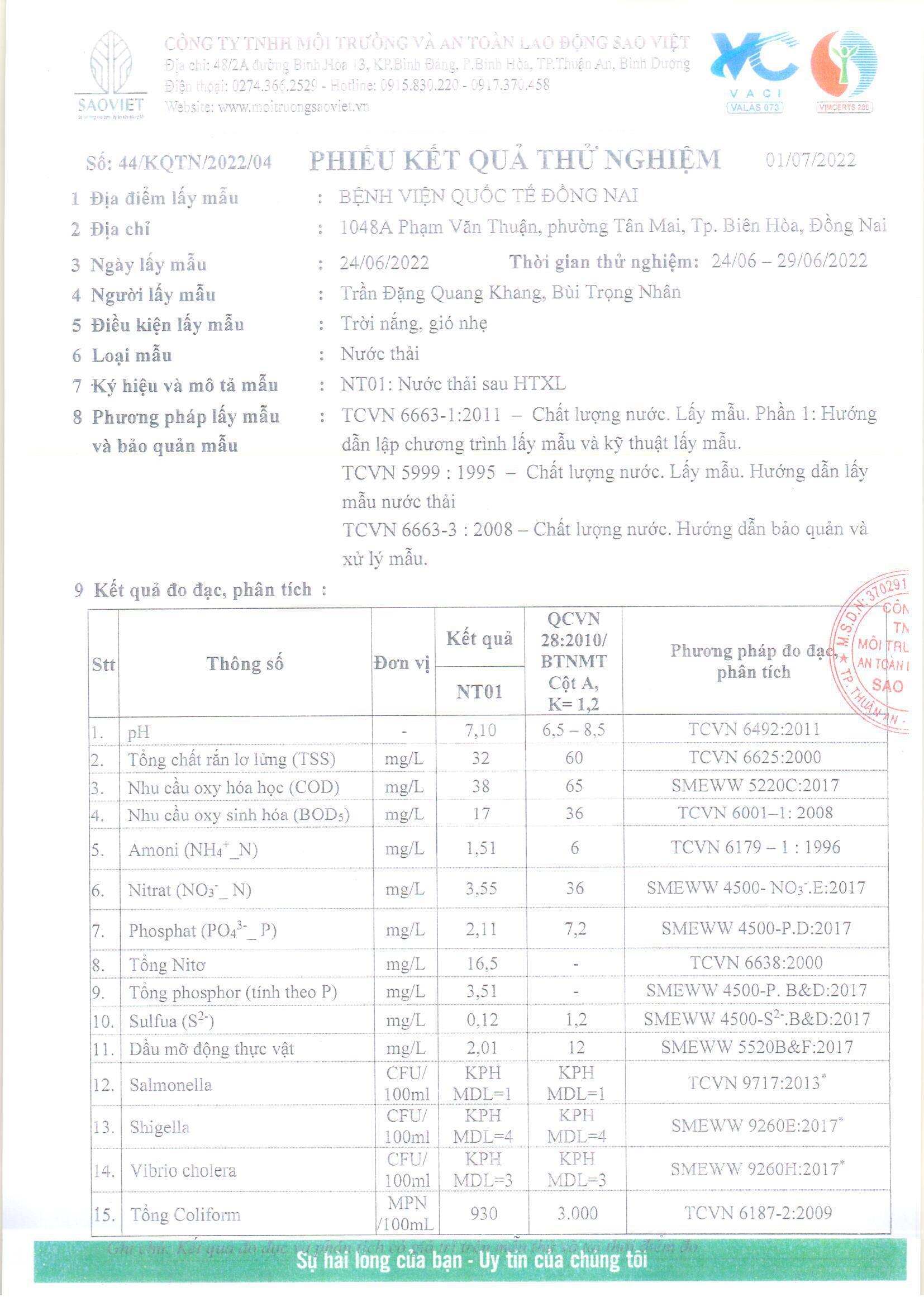 Kết quả quan trắc học 2022 Bệnh viện Hoàn Mỹ Đồng Nai