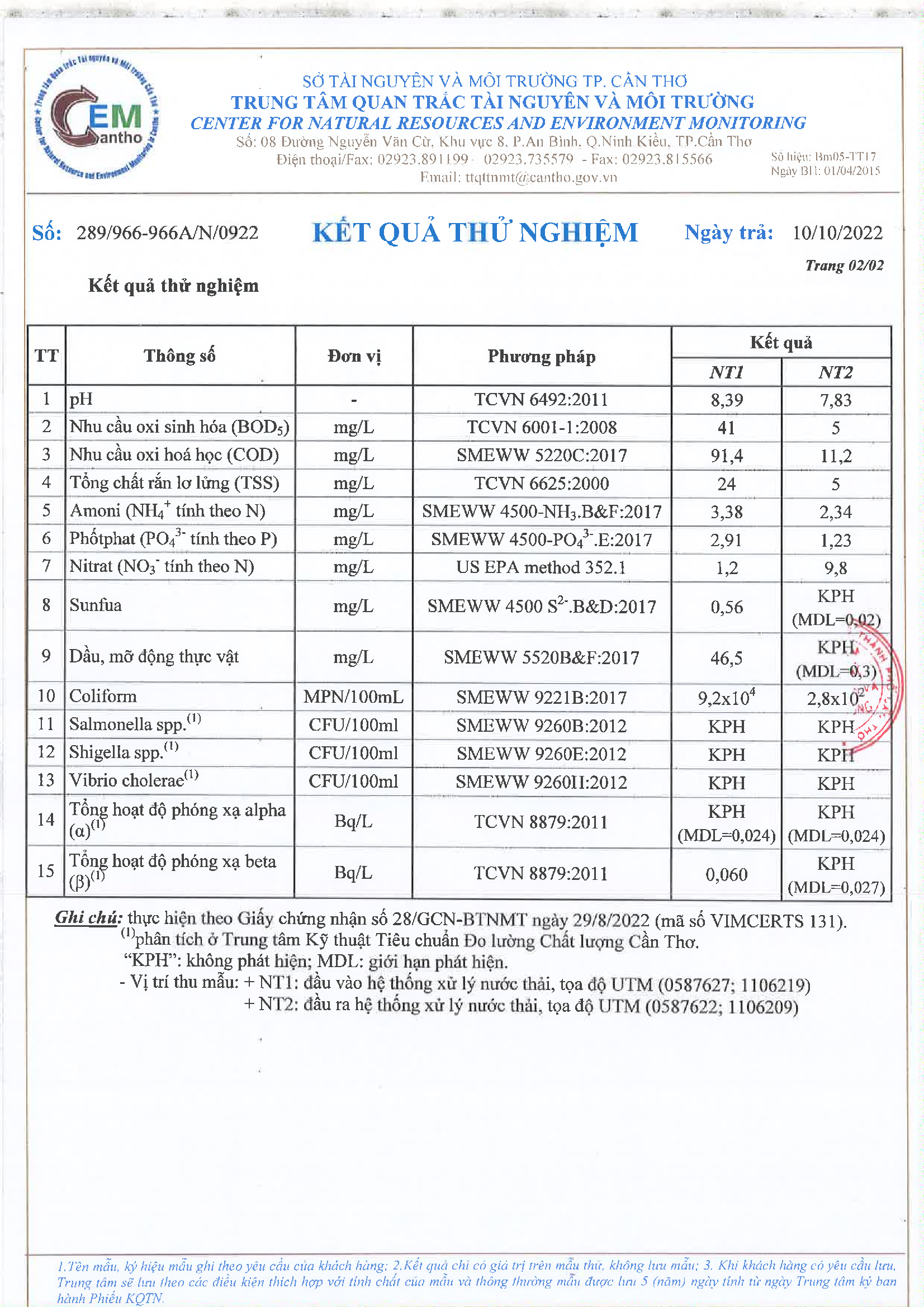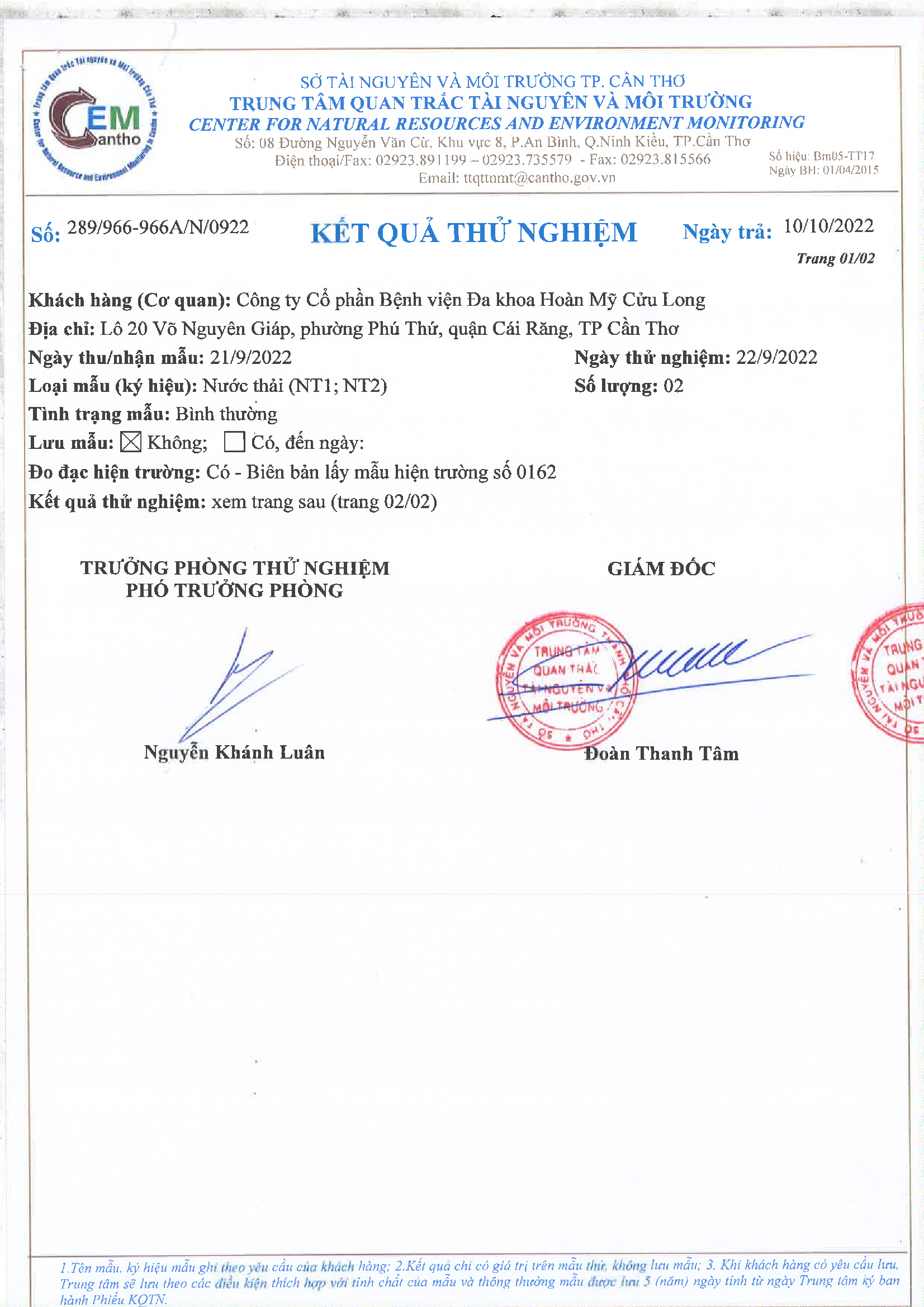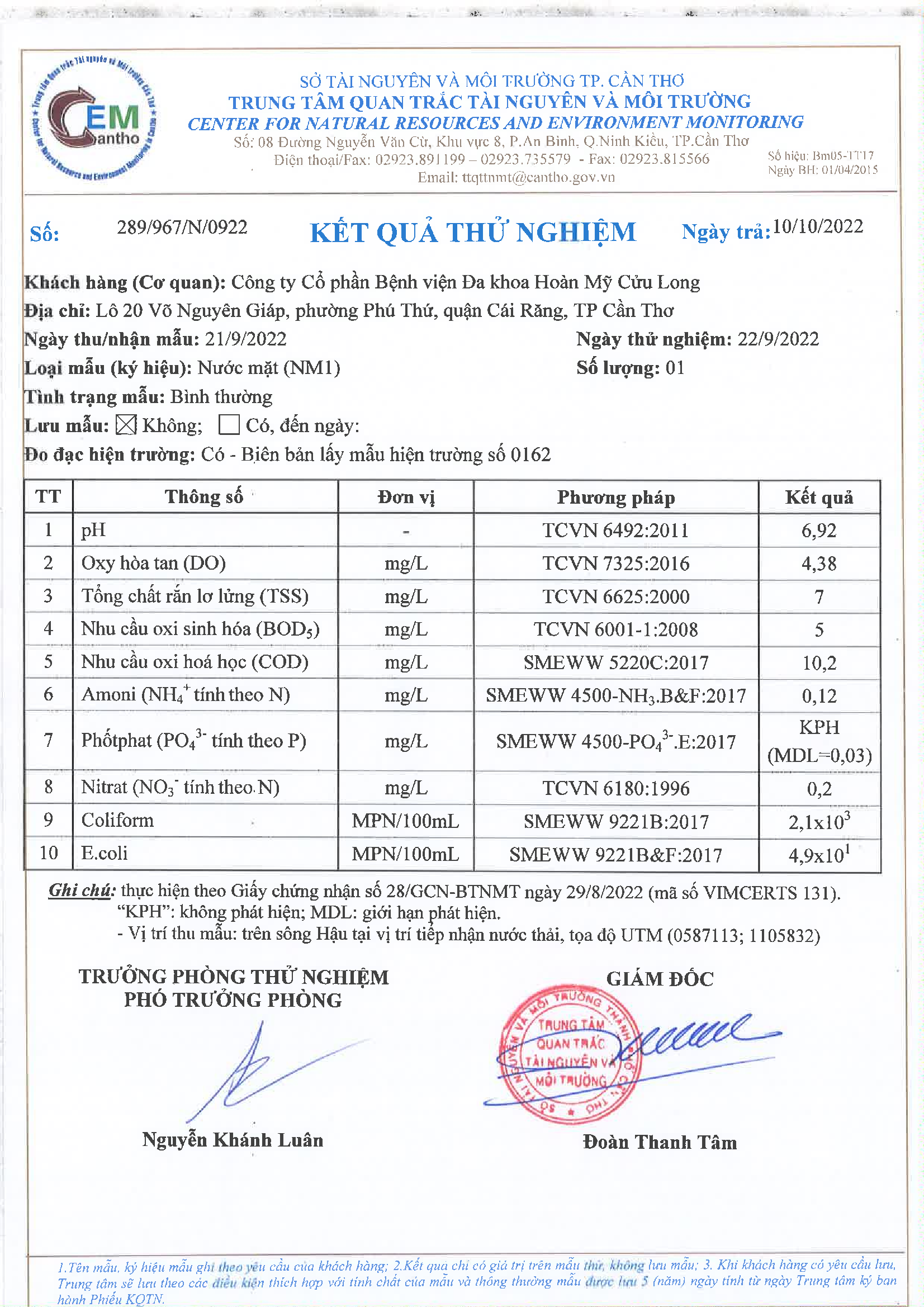 Kết quả quan trắc học quý III – 2022 Bệnh viện Hoàn Mỹ Cửu Long