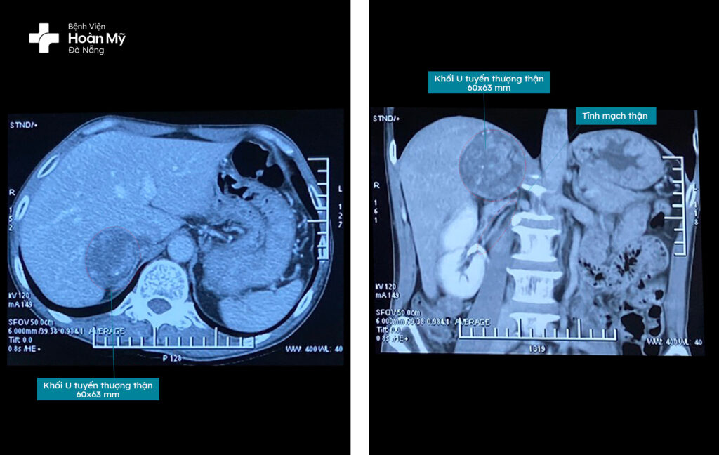 Ngày 9/5/2023, anh N.V.C (55 tuổi, trú tại TP.Đà Nẵng) trong khi thăm khám sức khỏe định kỳ tại Bệnh viện Hoàn Mỹ Đà Nẵng được các bác sĩ phát hiện khối u ở hạ sườn phải. Kết hợp kết quả thăm khám, xét nghiệm, chụp CT, hội chẩn chuyên khoa, bác sĩ Bệnh viện Hoàn Mỹ Đà Nẵng chẩn đoán người bệnh có khối u tuyến thượng thận phải, kích thước (63x60mm) và chỉ định phẫu thuật cắt bỏ u tuyến thượng thận phải.