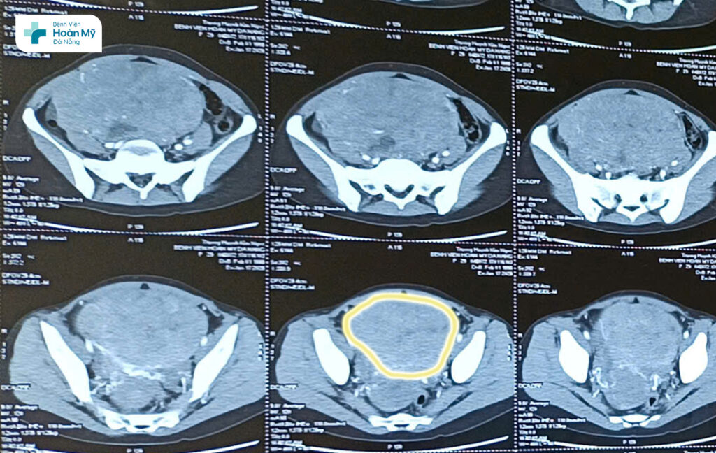 Tại Bệnh viện Hoàn Mỹ Đà Nẵng, qua thăm khám lâm sàng, siêu âm, chụp cắt lớp vi tính có cản quang, kết quả xác định phía đáy mặt ngoài tử cung của chị K có khối u kích thước lớn (19x16cm) choán đầy trong vùng tiểu khung và có các ổ dịch đã hoại tử. Khối u cũng chèn đẩy các cấu trúc lân cận, chèn niệu quản phải gây thận ứ nước độ 1.