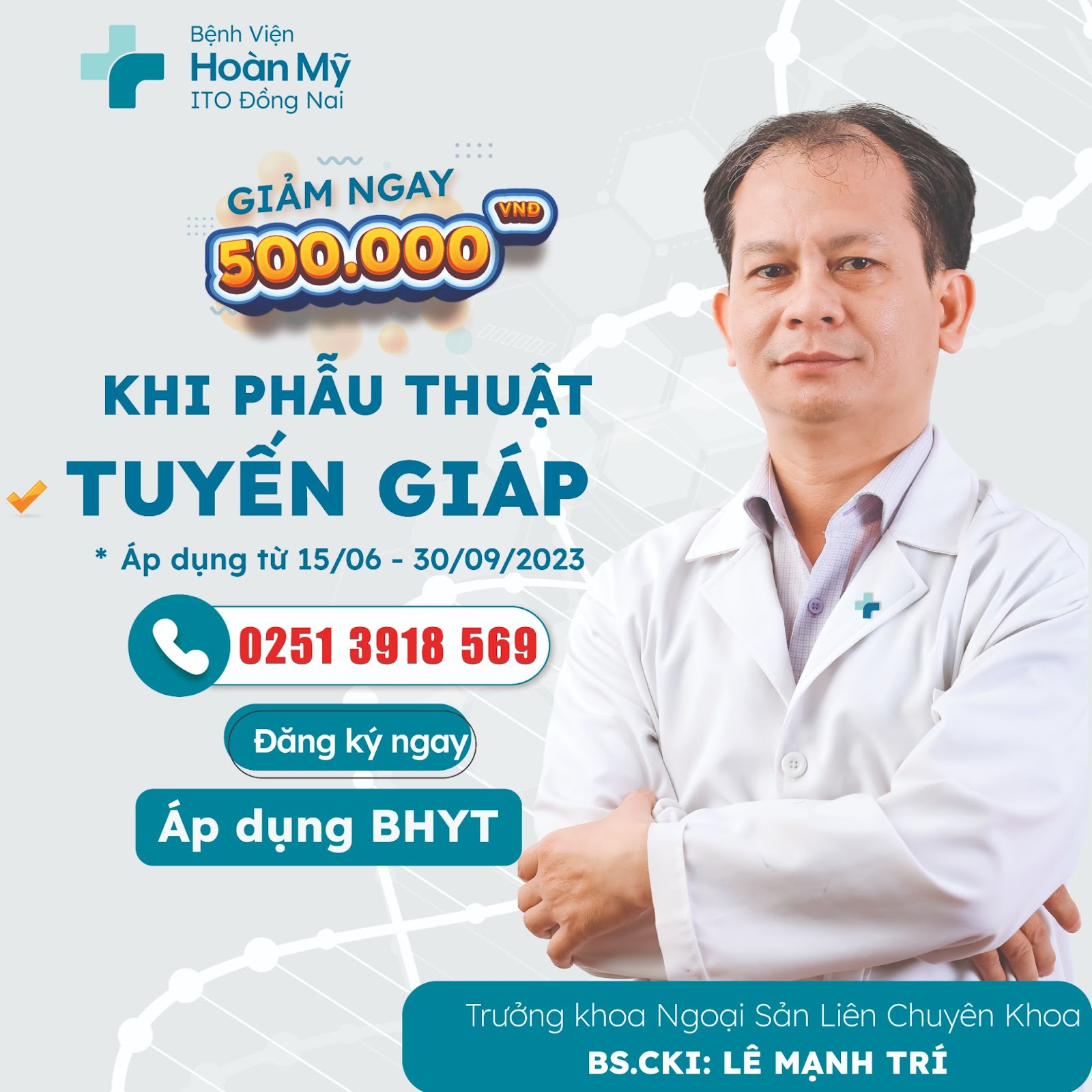 Đặc biệt, nhằm hỗ trợ và đồng hành cùng người bệnh, từ ngày 15/6 - 30/9/2023 Bệnh viện Hoàn Mỹ ITO Đồng Nai có chương trình ưu đãi giảm 500.000đ khi phẫu thuật tuyến giáp. Quý khách có thể liên hệ Hotline 02513 918 569 (giờ hành chính) hoặc Zalo Bệnh viện Hoàn Mỹ ITO Đồng Nai để đặt lịch hẹn trước.